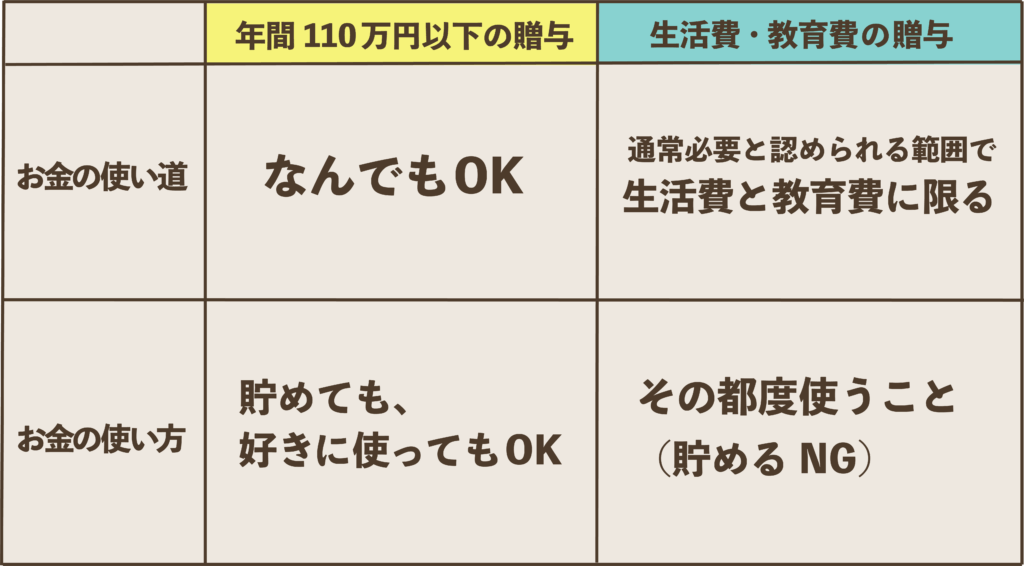 「110万円以内の贈与」と「生活費・教育費」のルールは、併用できます。