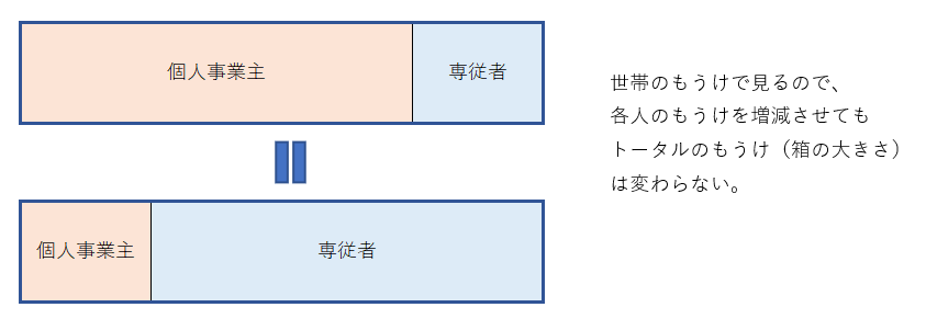 世帯単位でもうけを合算して計算するため、専従者の給与を増やして個人事業主のもうけを下げたとしても、専従者のもうけが増え、世帯単位でみればもうけの大きさは変わらないということになります。